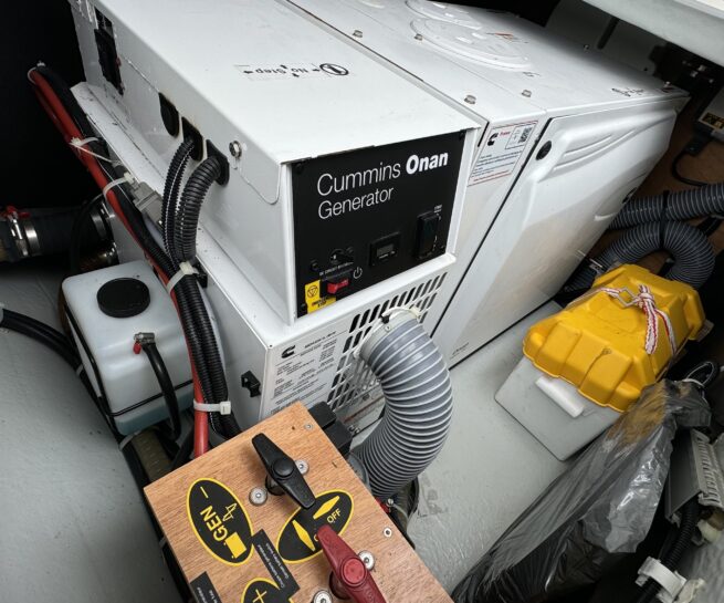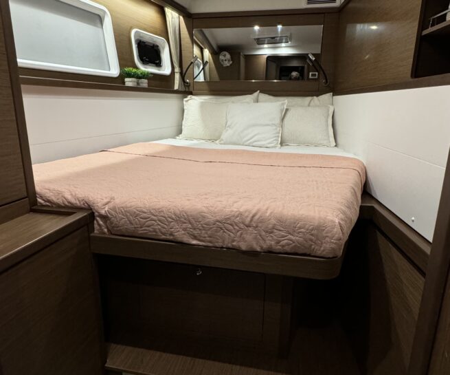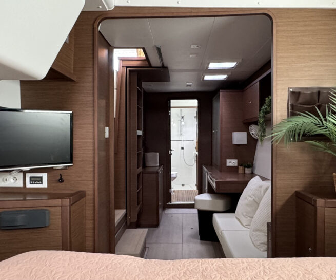 The twin upgraded 57hp Yanmar diesels with saildrives and folding propellers, delivered 9 knots at 3,200 rpm (wide-open-throttle). A more efficient, but still respectable cruising speed can be found at 2,400 rpm and a speed of 7.8 knots.