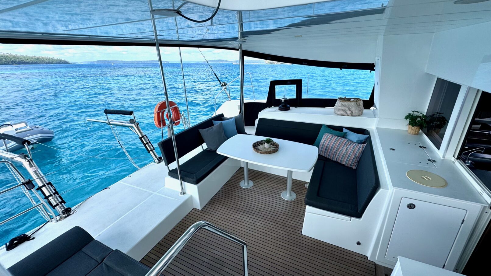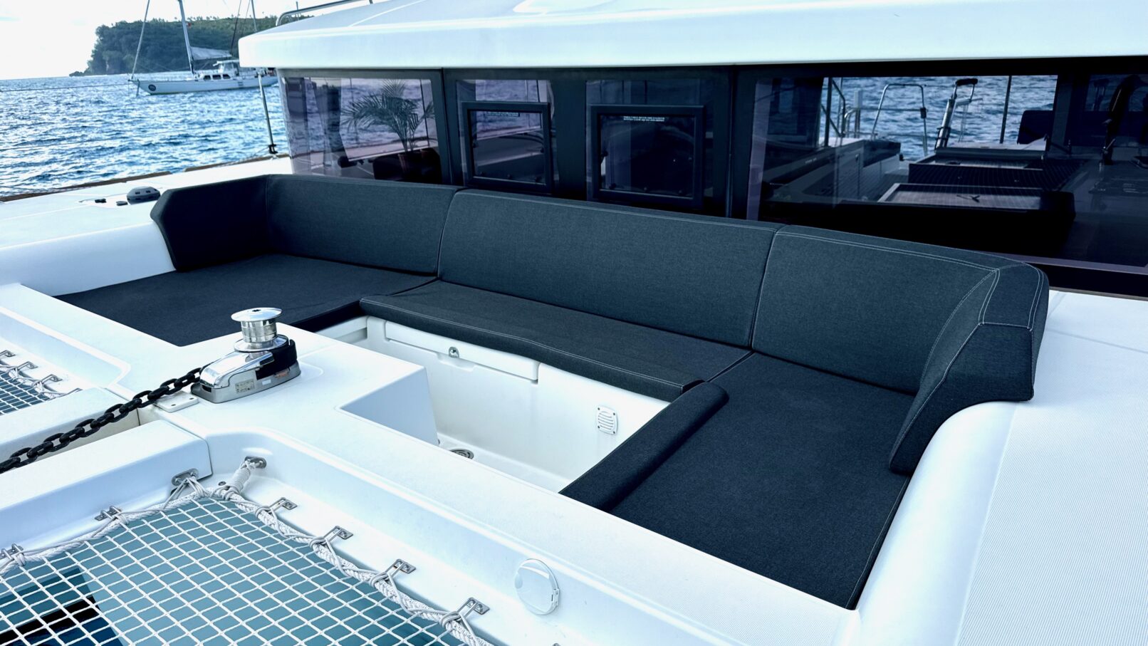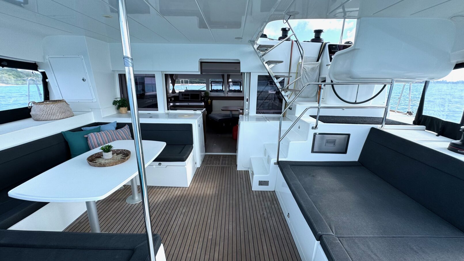 The thoughtfully designed deck layout maximizes both functionality and comfort. The spacious cockpit, sheltered by a sleek hardtop, provides ample seating for alfresco dining and socializing, while wide side decks ensure easy and safe movement around the boat. With convenient access to the helm and plenty of storage, this deck layout is perfect for both relaxed cruising and active sailing.